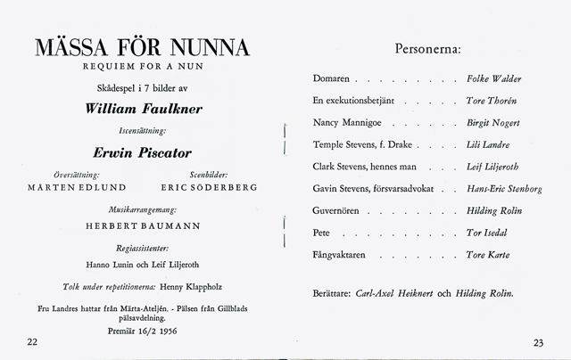 Besetzungszettel des Folkets Hus Teater in Göteborg zu "Requiem für eine Nonne"