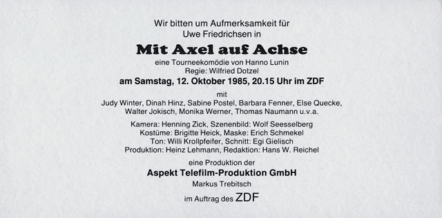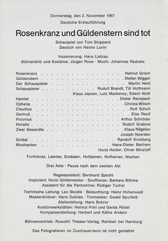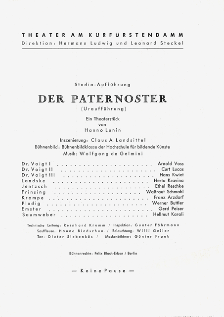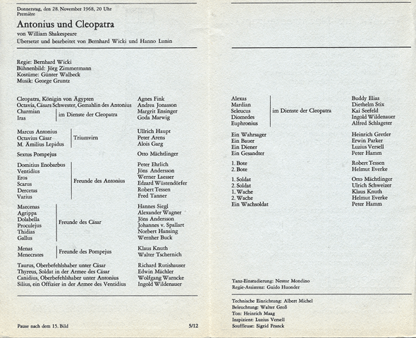 Besetzungszettel der Deutschen Erstaufführung im Schiller-Theater Berlin