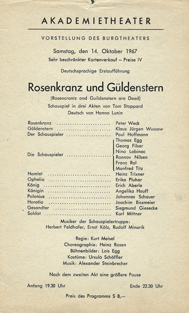 Besetzungszettel der Deutschsprachigen Erstaufführung im Burgtheater Wien