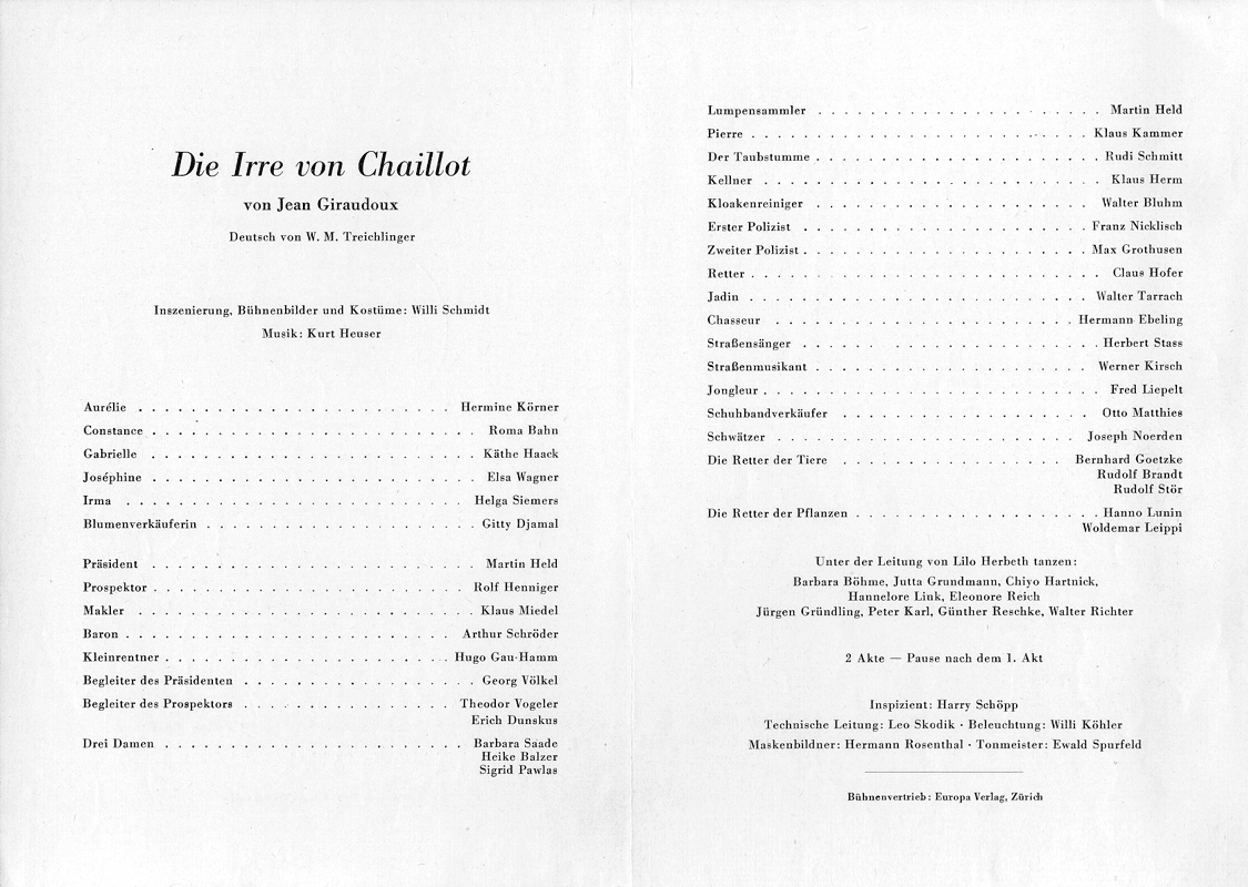 Besetzungszettel "Die Irre von Chaillot" im Schiller-Theater Berlin