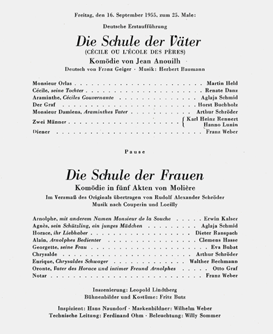 Besetzungszettel "Schule der Väter" im Schloßpark-Theater Berlin