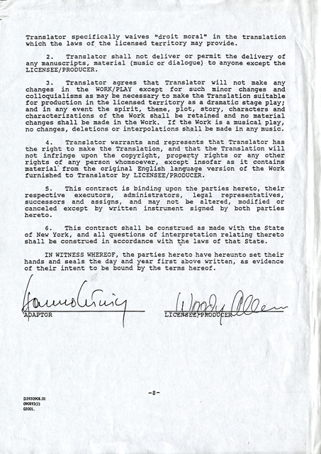Achte Seite des Vertrags zur deutschen Theaterfassung des Kinofilms "Husbands and Wives" von Woody Allen