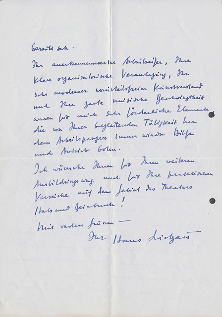 … Ihr anerkennenswerter Arbeitseifer, Ihre klare organisatorische Veranlagung, Ihr sehr moderner vorurteilsfreier Kunstverstand und Ihre zarte musische Beschwingtheit waren für mich sehr förderliche Elemente, die von Ihrer begleitenden Tätigkeit her dem Arbeitsprozeß immer wieder Hilfe und Antrieb boten.«