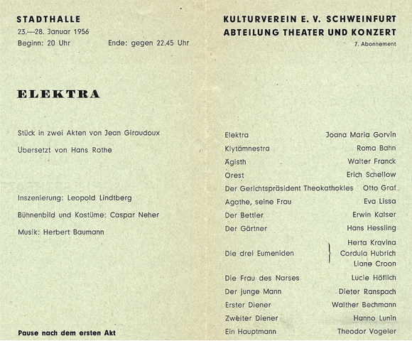 Dazu festumrissene Nebenrollen: Herta Kravina, Cordula Hubrich und Liane Croon als die drei Eumeniden, Dieter Ranspach als Junger Mann, Walther Bechmann und Hanno Lunin als Erster und Zweiter Diener … «.